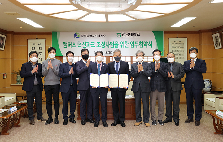 전남대는 8일 오전 대학본부 5층 접견실에서 광주도시공사(사장 노경수)와 협약을 맺고, 캠퍼스 유휴부지를 활용해 캠퍼스 혁신파크를 조성하는데 두 기관이 적극 협력하기로 했다.