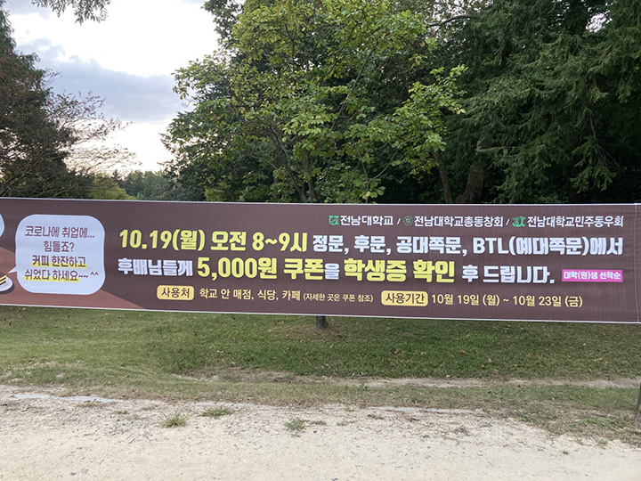 전남대학교와 전남대총동창회, 전남대민주동우회가 공동으로 ‘코로나19’로 지친 학생들을 응원하기 위해 5.000원권 무료이용권을 배부하기로 해 눈길을 끌고 있다.