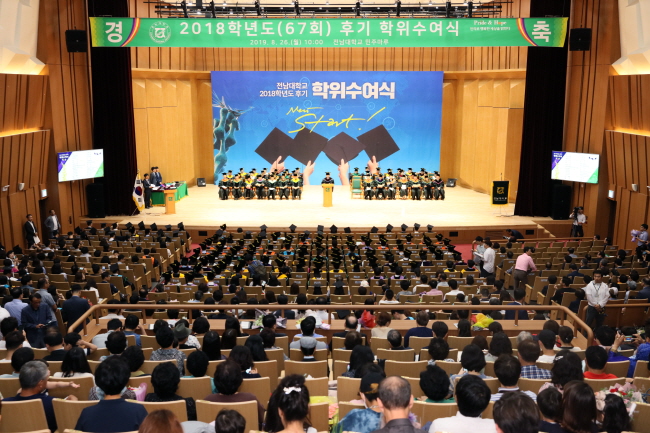 전남대학교가 8월 26일 오전 교내 민주마루(대강당)에서 2018학년도 후기학위수여식을 갖고 학사 1,240명, 석사 295명, 박사 117명, 명예박사 1명 등 모두 1,653명의 졸업생에게 학위를 수여했다.