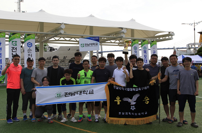 전남대 교직원들로 구성된 축구동호회(회장 지철열)는 지난 7월 12일 목포해양대학교에서 열린 이번 대회에서 5전 전승, 무실점의 완벽한 경기력으로 대회를 지배하며 우승을 차지했다.