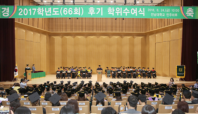 전남대학교 ‘2017학년도 후기학위수여식’이 8월 24일(금) 오전 교내 민주마루(옛 대강당)에서 졸업생과 가족, 교직원 및 재학생, 동문 등 1,500여 명이 참석한 가운데 성대하게 치러졌다.