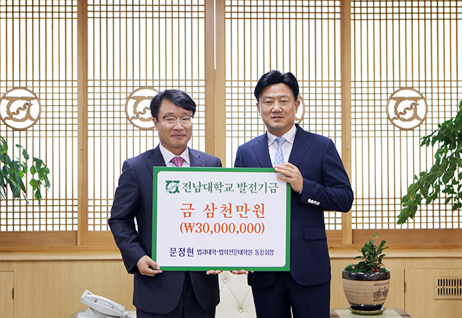 문 변호사는 “적은 금액이지만 후배들이 훌륭한 법조인, 나아가 미래를 이끌 동량으로 자라나는 데 보탬이 되고, 전남대학교가 지역민의 사랑을 받는 명문대학으로 발돋움하는 데 유용하게 쓰였으면 한다.”고 말했다.