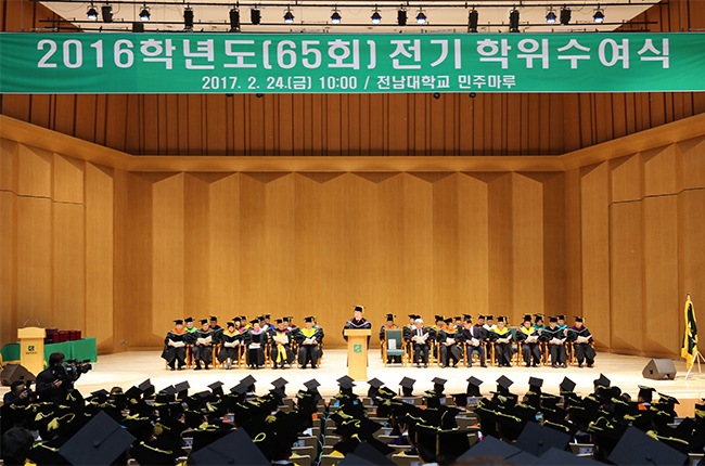 전남대학교(총장 정병석) 2016학년도(제65회) 전기 학위수여식이 2월 24일(금) 오전 10시 광주캠퍼스 민주마루(구 대강당), 오후 3시 여수캠퍼스 체육관에서 각각 열린다.