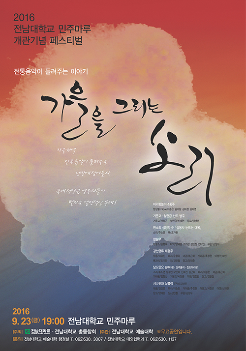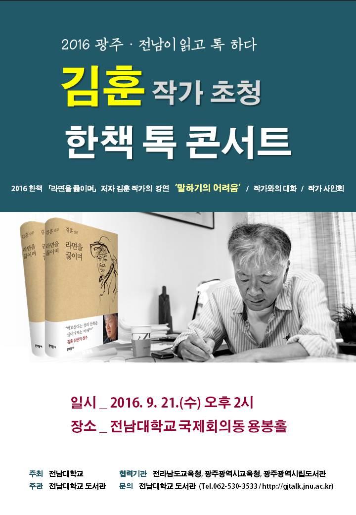 전남대학교(총장 지병문)가 오는 9월 21일(수) 오후 2시 대학본부 국제회의동 2층 용봉홀에서 '2016 광주·전남이 읽고 톡 하다 – 작가 초청 한책 톡 콘서트’를 개최한다.