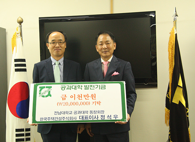 한국주택건설(주) 정석우 대표이사가 전남대학교 공과대학에 발전기금 2,000만원을 기탁했다.
