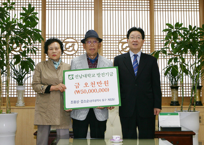 사립학교 퇴직교사인 조용상(81) 선생은 27일 오전 전남대학교 대학본부 5층 총장실에서 지병문 총장에게 “가정형편이 어렵고 성적이 우수한 학생을 위한 장학금으로 써달라”며 발전기금 5,000만원을 전달했다.