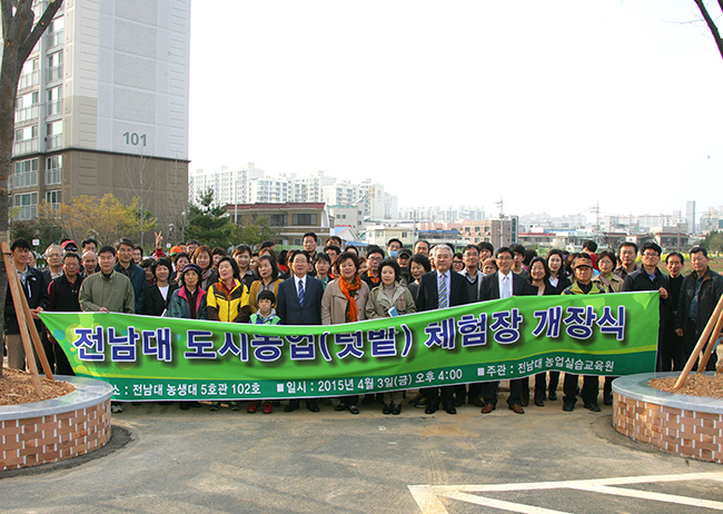 전남대학교는 3일 오후 5시 광주캠퍼스 농업생명과학대학 5호관 1층 대강당과 농업실습교육원 실습장에서 ‘2015년 도시텃밭’ 개장식을 가졌다. 이날 행사에는 텃밭 분양 시민과 가족 등 400여 명이 참석, 뜨거운 열기를 보여줬다.
